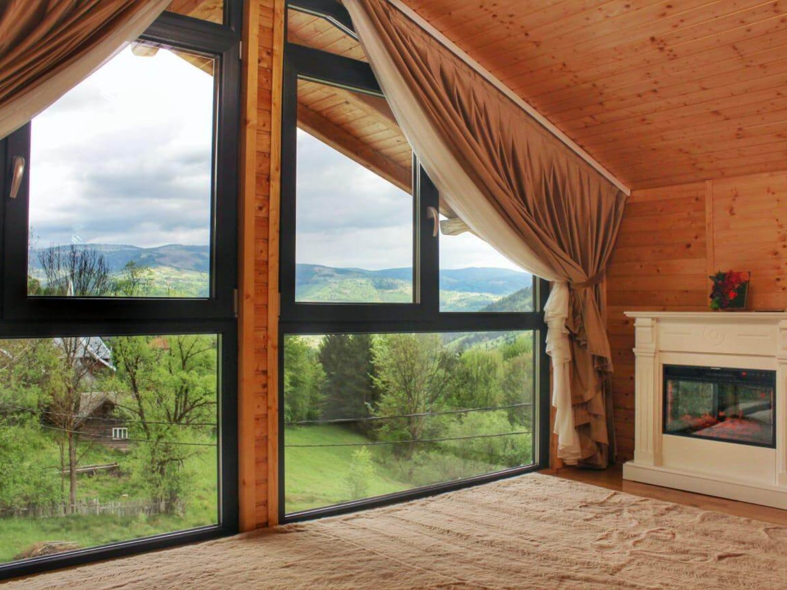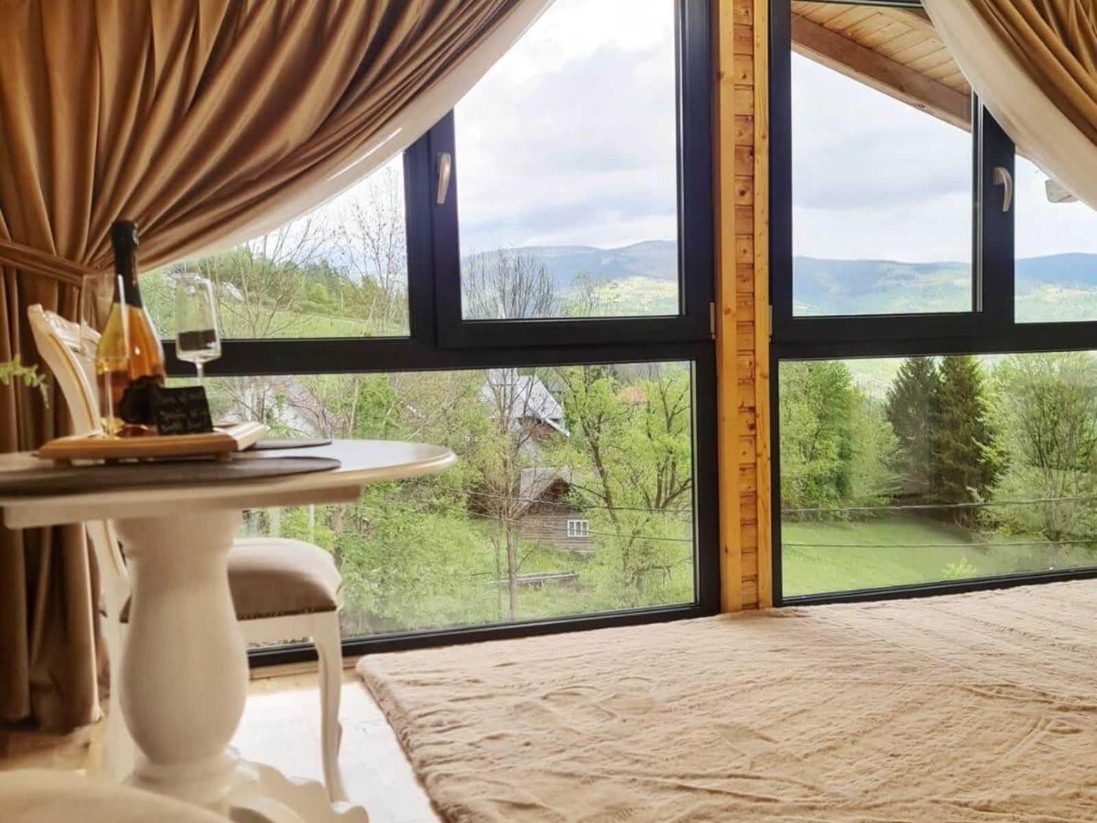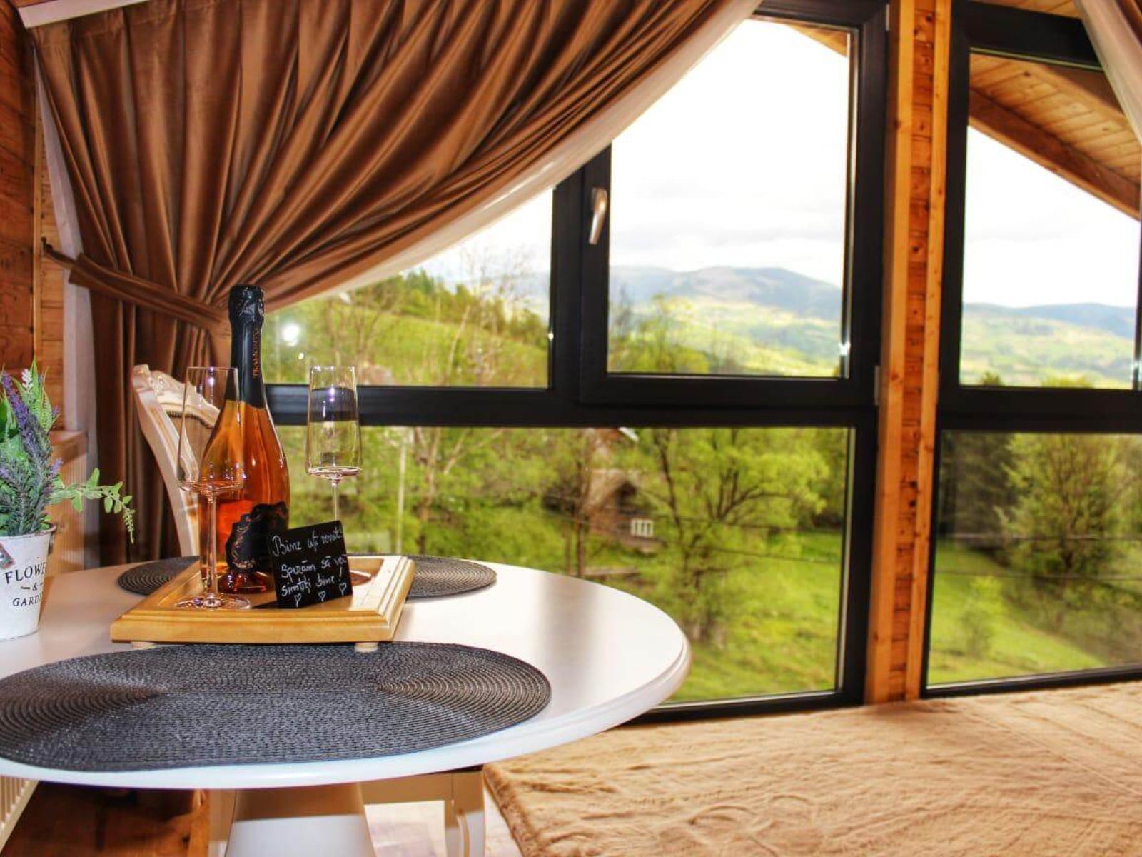 Priveliștea spectaculoasă către grădina panoramică creează o atmosferă de liniște și confort.