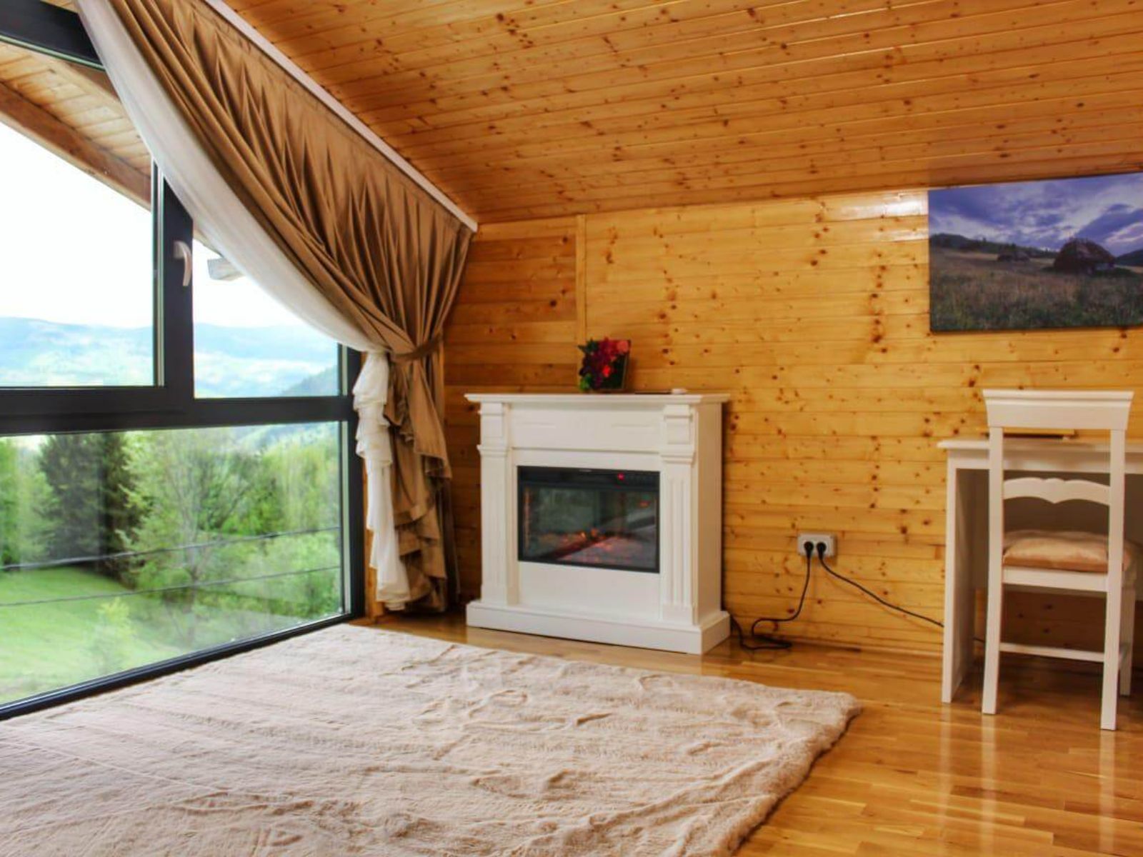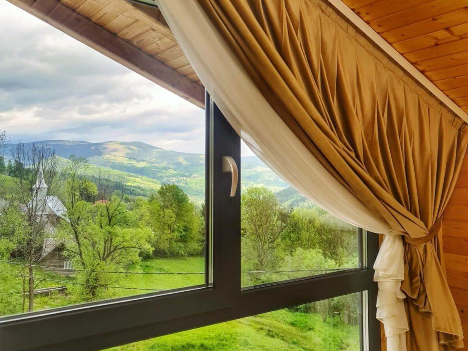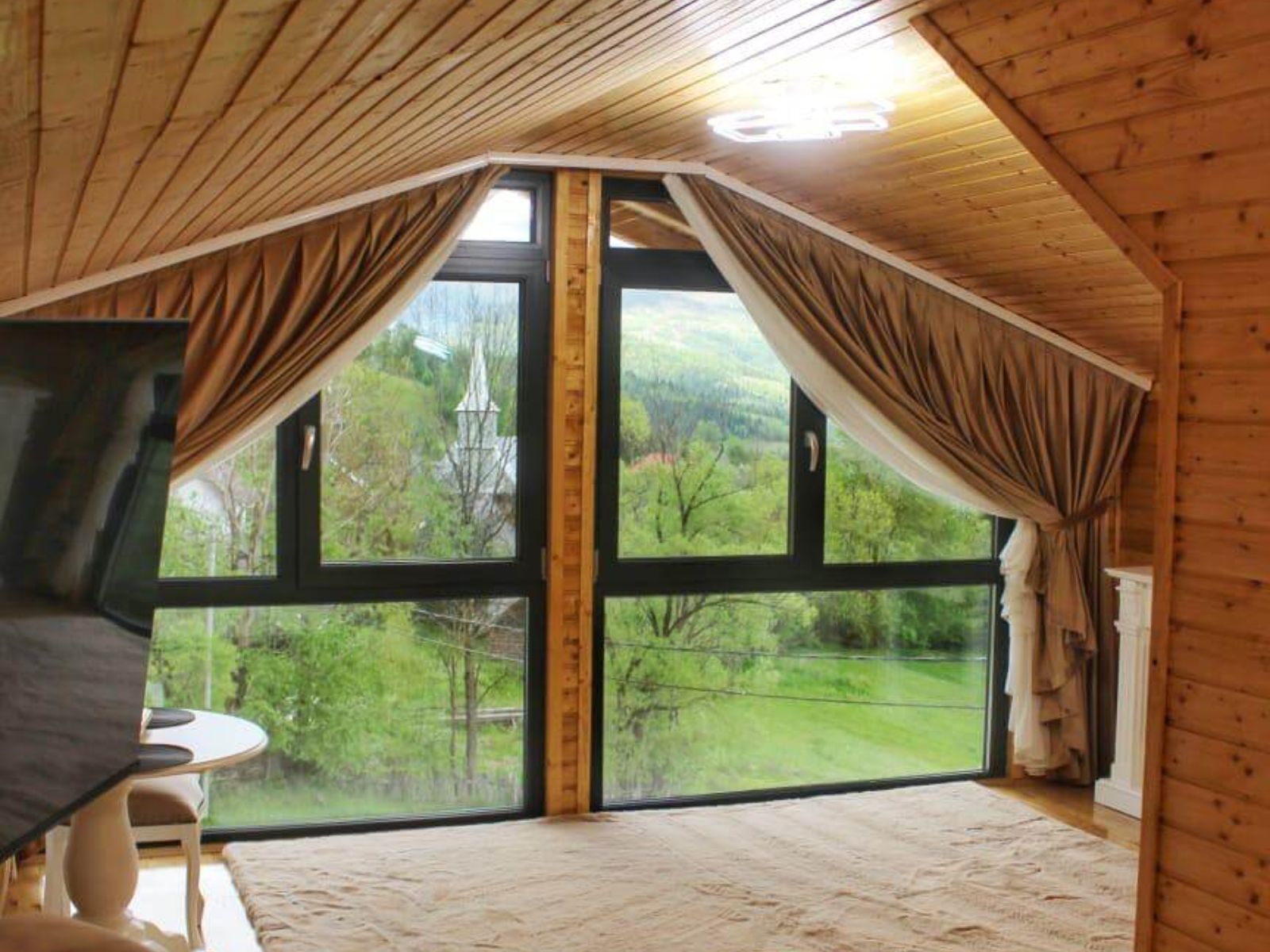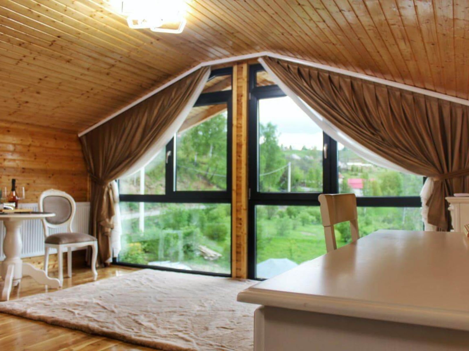 Priveliștea spectaculoasă către grădina panoramică creează o atmosferă de liniște și confort.